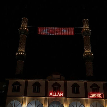 İzmir Kavaklıpınar Camii projemizde, geleneksel mahya kültürünü günümüzün dijital imkanlarıyla yeniledik. Minareler arasına yerleştirdiğimiz yüksek ışık gücüne sahip bu sistem, mesajların her türlü hava koşulunda net bir şekilde okunmasını sağlıyor. Enerji tasarrufu sağlayan ve estetik duruşuyla dikkat çeken dijital mahyamız, caminin gece güzelliğine modern bir dokunuş ekledi.